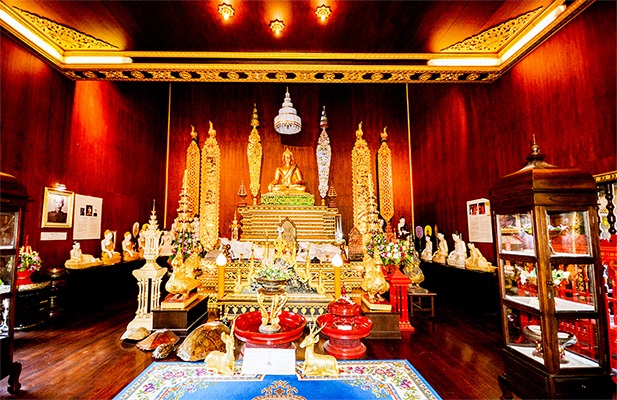 1. พระพุทธศรีเชียงราย พระประธานโฮงหลวงแสงแก้ว เป็นพุทธรูปปางมารวิชัยวัสดุโลหะปิดทองศิลปะแบบเชียงแสนสิงห์หนึ่ง ออกแบบโดย รองศาสตราจารย์เสนอ นิลเดช สร้างเมื่อ พ.ศ.๒๕๔๔ Phra Buddha Sri Chiang Rai In the style of Chiang Saen, this bronze image, covered with gold leaf, is seated in the position of Calling the Earth to Witness. Designed by Associate Professor Saner Nindej. It was commissioned in 2001 as the presiding Buddha image in the Hong LuangSaengKaew, the museum of WatPhraKaew.